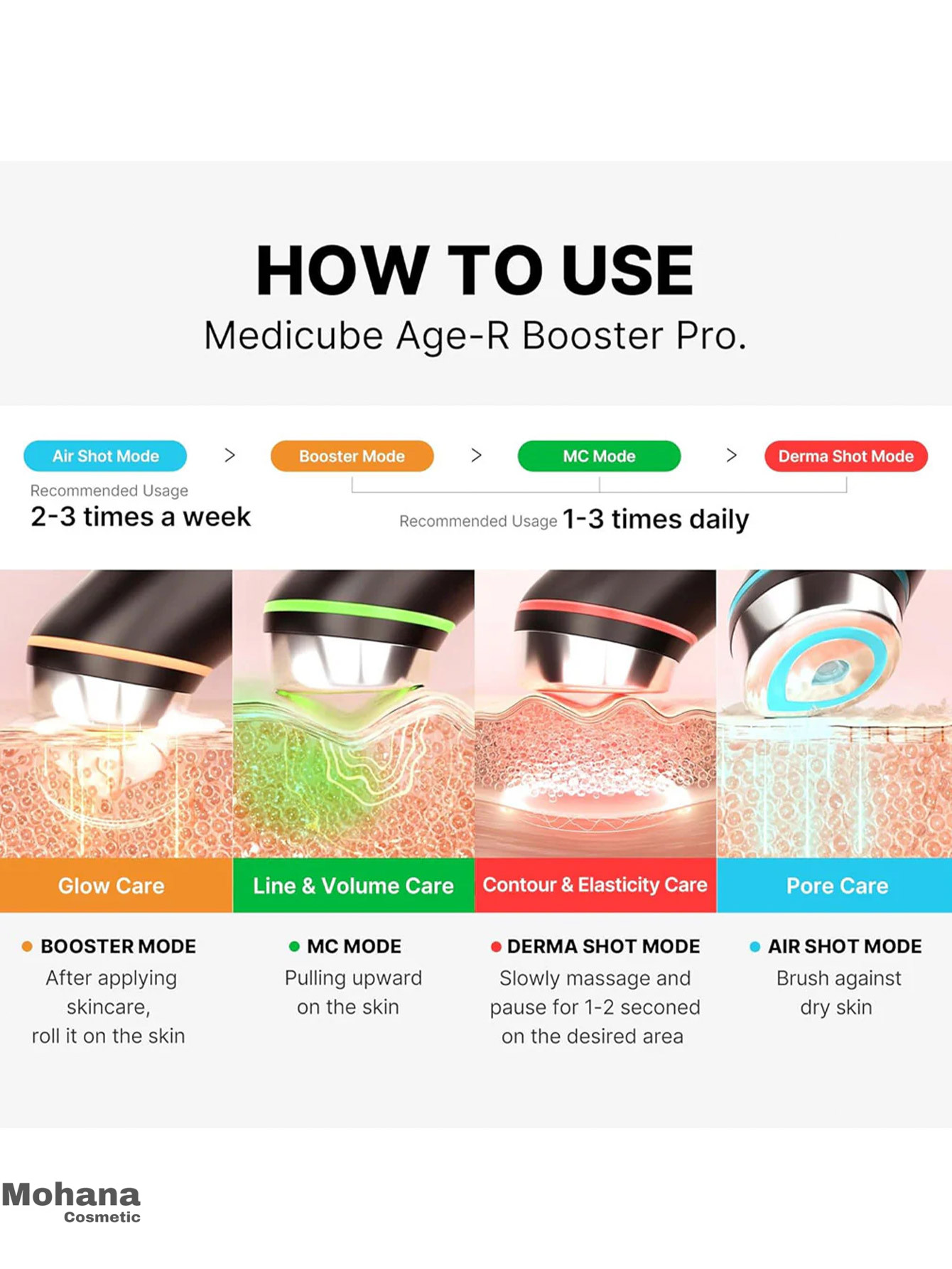 دستگاه Pro Booster یکی از ابزارهای پیشرفته‌ی مراقبت پوستی برند کره‌ای Medicube است که با استفاده از تکنولوژی EMS (تحریک الکتریکی عضلات)، گرما درمانی و نور درمانی (LED Therapy) به بهبود کیفیت پوست کمک می‌کند. این دستگاه به جذب بهتر مواد مراقبتی (مانند سرم‌ها و آمپول‌ها) کمک کرده و باعث افزایش شفافیت، سفتی و طراوت پوست می‌شود.
