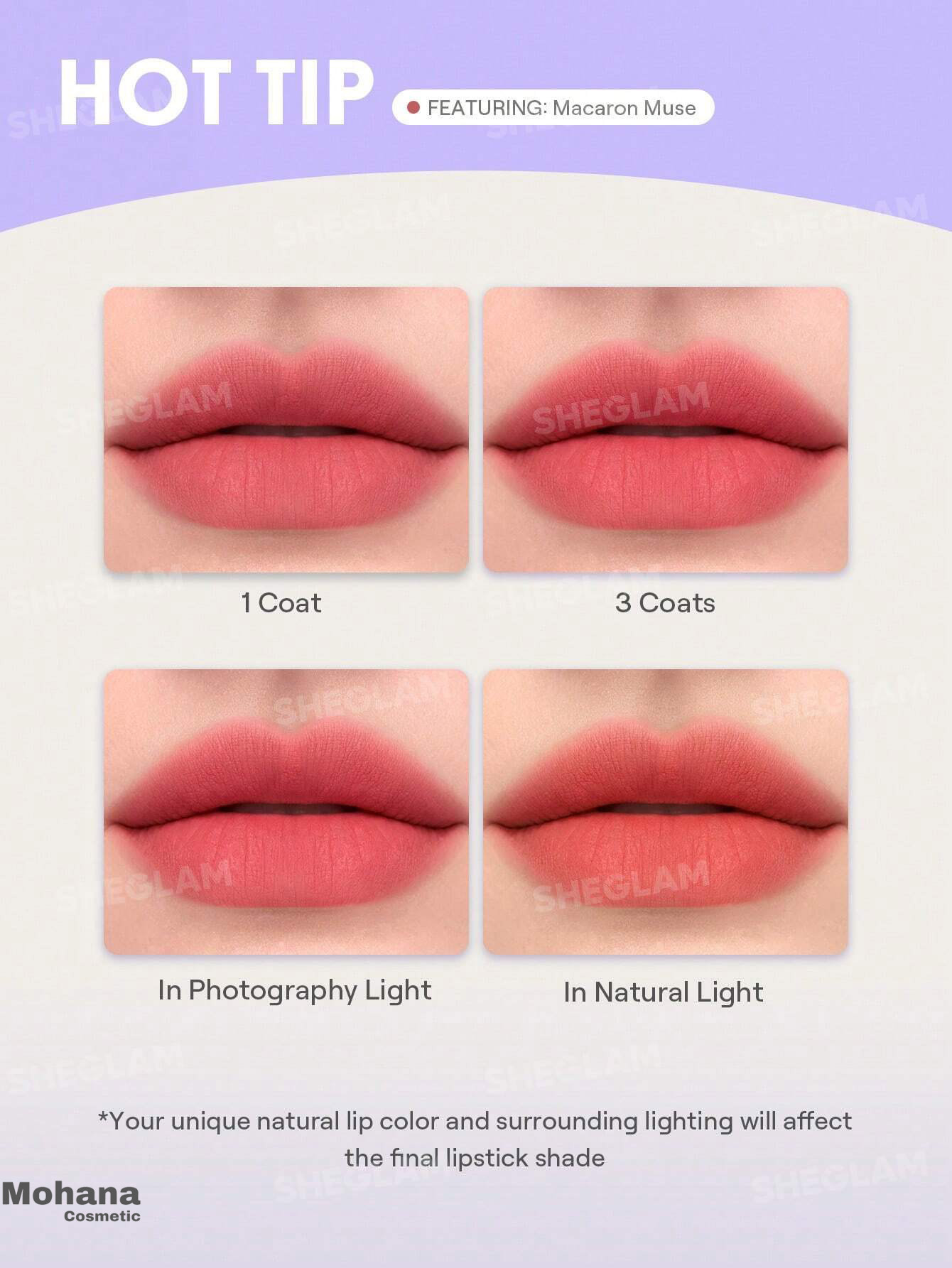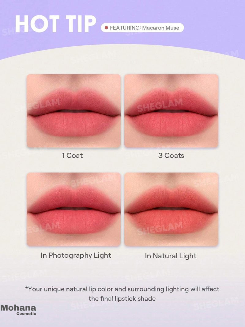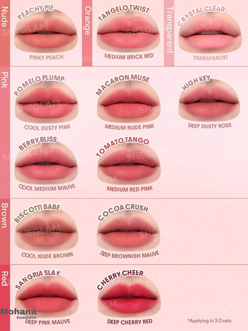 Berry Bliss, Biscotti Babe, Cherry Cheer, Cocoa crush, Crystal Clear, HIGH KEY, Macaron Muse, Peachy Pie, Pomelo Plump, Sangria Slay, Tangelo Twist, Tomato Tango