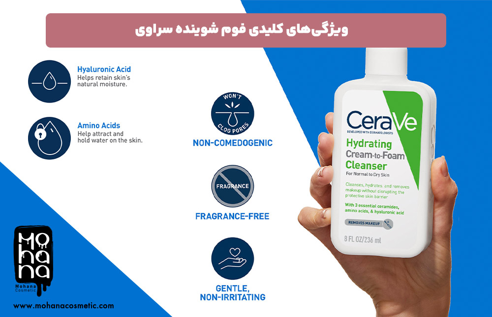 فوم شوینده کرمی “Hydrating Cream-to-Foam Cleanser” از برند CeraVe با طراحی خاص برای پوستهای نرمال تا خشک ساخته شده است. این شوینده برند سراوی هنگامی که با آب ترکیب شود، از بافت اولیۀ کرم به فومی نرم تبدیل میگردد، و ضمن حذف آلودگی، آرایش سبک و ذرات روزانه، رطوبت طبیعی پوست را حفظ میکند و پوست را بعد از شستشوی صورت بدون احساس کشیدگی یا خشکی رها میکند.این محصول فاقد عطر، غیرکومدوژنیک و با pH متعادل است و به تقویت سد محافظ پوست کمک مینماید.