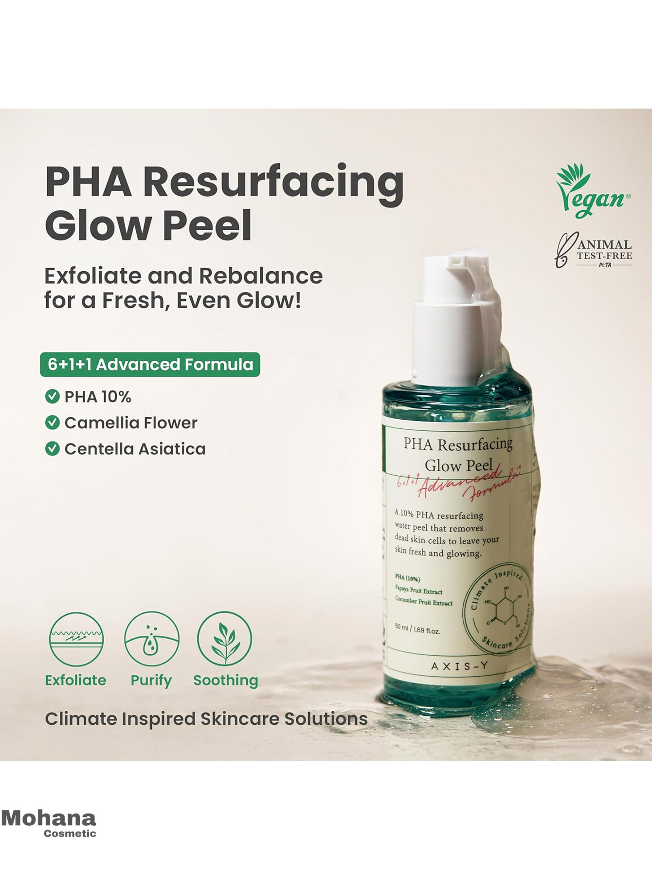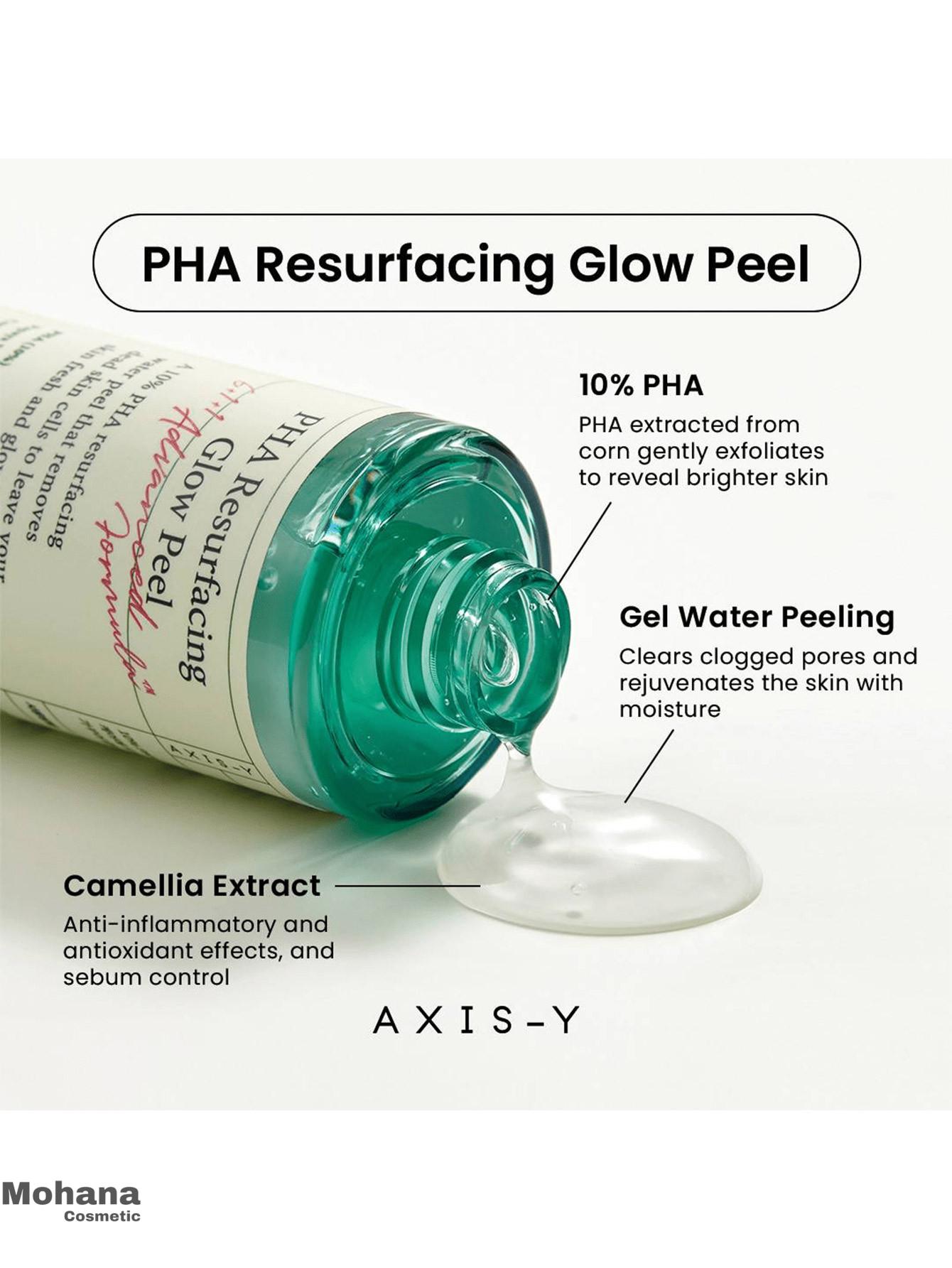 لایه‌بردار PHA Resurfacing Glow Peel از برند Axis-Y یک ژل آبی شفاف با ۱۰٪ گلوکونولاکتون (PHA) است که به‌طور ملایم پوست را لایه‌برداری کرده و منافذ را پاکسازی می‌کند. این سرم پوستی با ترکیبات گیاهی مانند عصاره خیار، پاپایا و سنتلا آسیاتیکا، پوست را تسکین داده و به آن درخشش طبیعی می‌بخشد.