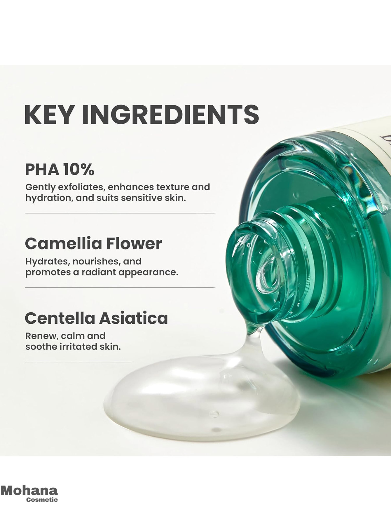 • عملکرد: لایه‌برداری ملایم با PHA، روشن‌کنندگی و درخشش پوست، تسکین‌دهنده و تقویت سد پوستی، مناسب برای پوست‌های حساس و مستعد جوش