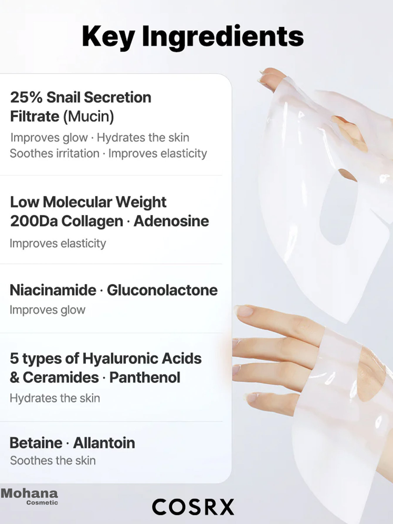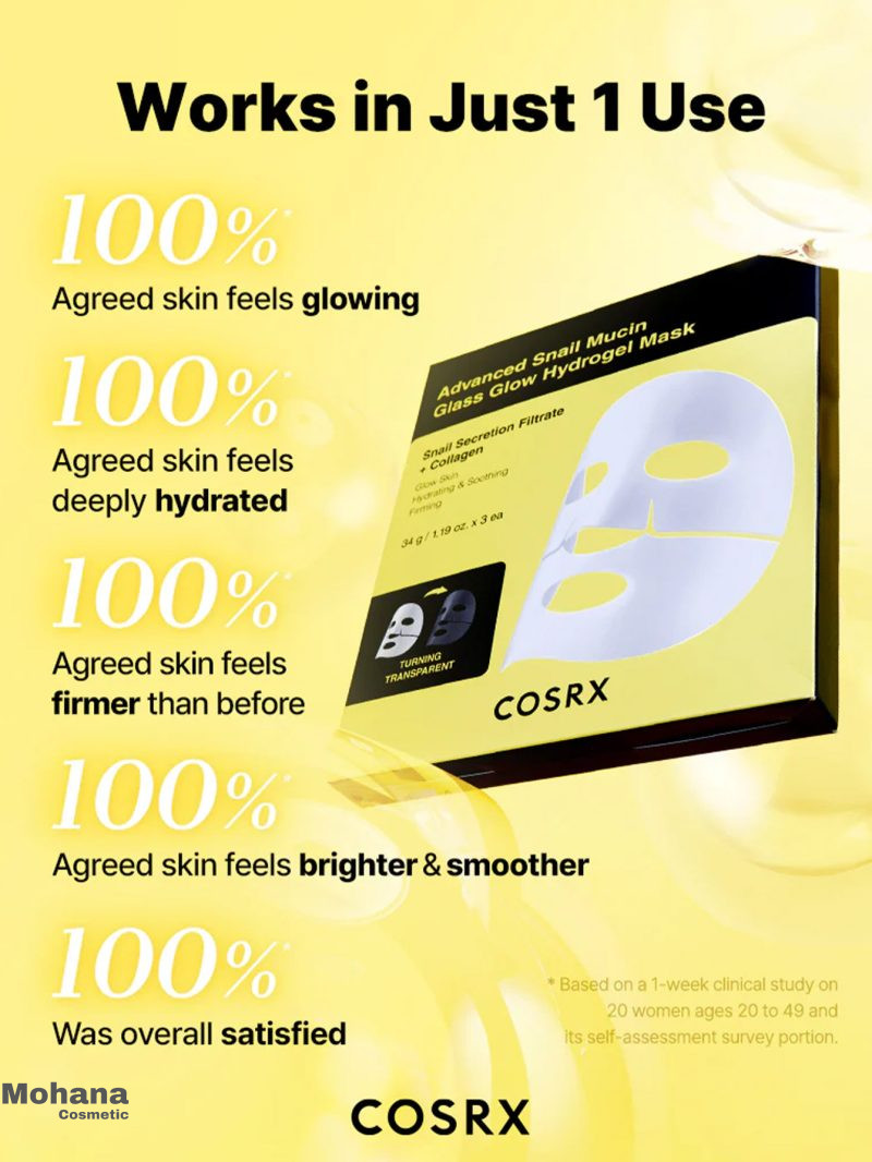 ماسک ورقه‌ای Advanced Snail 96 Mucin Power Essence از برند کوزارکس، با ترکیب ۹۶٪ حلزون موکین (Snail Mucin)، به‌ طور مؤثر به ترمیم و بازسازی پوست کمک می‌کند. این ماسک با استفاده از ورقه سلولزی طبیعی، به‌خوبی روی صورت می‌چسبد و اجازه می‌دهد سرم غنی از مواد مغذی به عمق پوست نفوذ کند. نتیجه استفاده از این ماسک، پوستی نرم، شاداب و درخشان است.