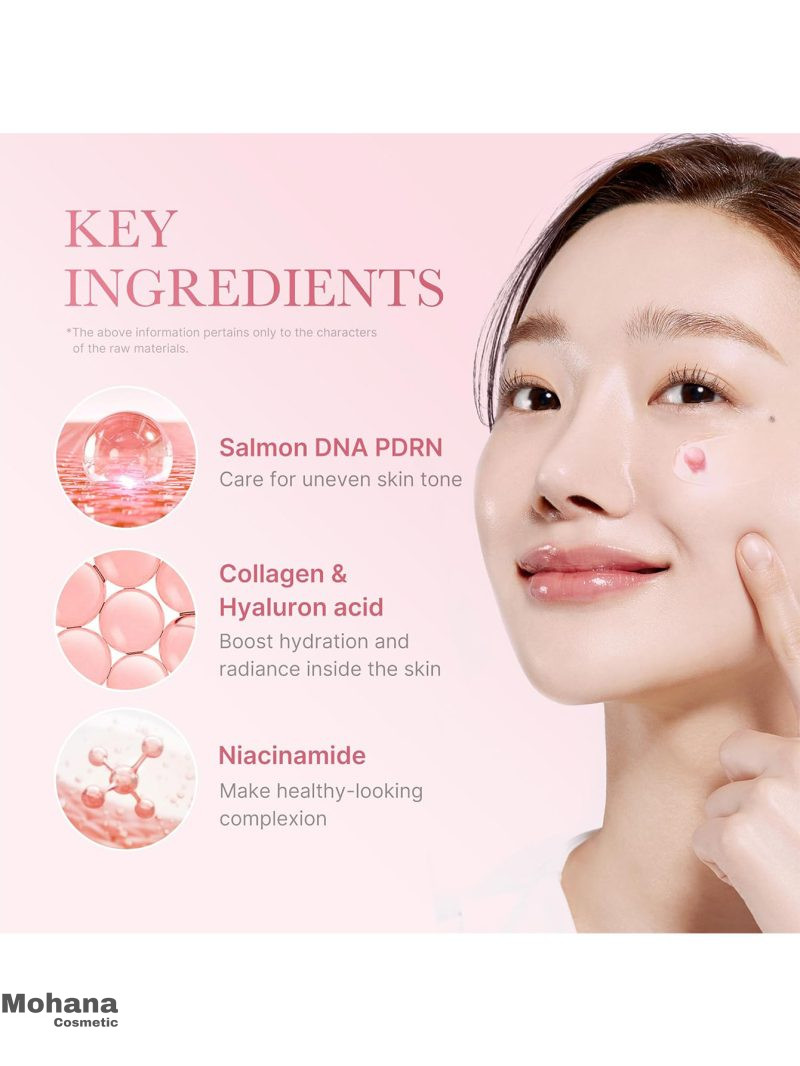 • افزایش استحکام و سفتی پوست: حاوی PDRN (پلی‌دئوکسی‌ریبونوکلئوتید) استخراج‌شده از DNA ماهی سالمون که به بازسازی سلولی و بهبود ساختار پوست کمک می‌کند.